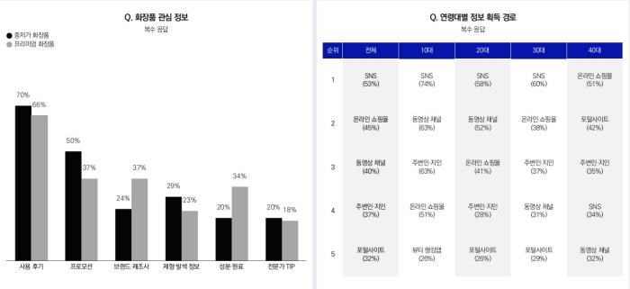 주로 어디서 화장품 정보를 얻느냐는 질문에 2030세대는 SNS를, 40대는 온라인 쇼핑몰을 1위로 꼽았다. 10대와 20대는 동영상 채널에서도 자주 정보를 탐색하며, 40대는 타 연령보다 포털사이트를 활용하는 비율이 높았다.