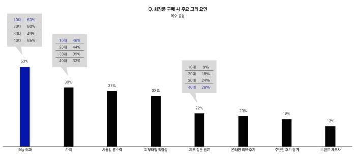 또한, 모든 연령대가 화장품을 구매할 때 효능효과를 가장 중요하게 여기는 것으로 조사됐다. 연령이 낮을수록 가격을 중요하게 생각하는 비율이 높고, 제조 성분과 원료는 연령이 높을수록 높게 나타났다.