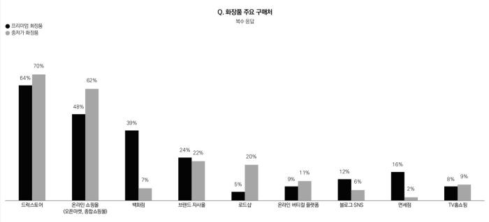 소비자들은 주요 드럭스토어나 온라인 쇼핑몰에서 화장품을 구매하는 것으로 확인됐다. 다만, 프리미엄 화장품은 백화점이나 면세점에서 구매하는 비율이 비교적 높다.