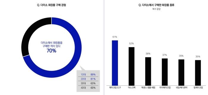 응답자 10명 중 7명은 다이소에서 화장품을 구매한 경험이 있다는 조사 결과도 나왔다. 70%에 달하는 응답자가 다이소에서 화장품을 구매한 적이 있으며, 연령이 낮을수록 다이소 구매 경험률이 높았다. 다이소에서는 주로 퍼프, 브러시같은 메이크업 도구를 가장 많이 구매하고, 그 다음으로는 마스크팩, 에센스 등 기초 화장품이 뒤를 이었다.