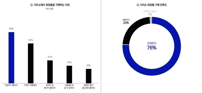 응답자들은 다이소에서 화장품을 구매하는 이유로 ‘가격 대비 성능이 좋아서’를 1순위로 꼽았다. 구매 만족도 또한 76%로 높게 나타났다.
