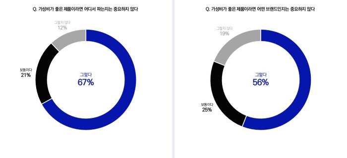 소비자들은 가성비가 좋은 제품이라면 판매처나 브랜드는 비교적 덜 중요하게 여긴다. 67%의 소비자들이 가성비가 좋은 제품이라면 판매처는 중요하지 않다고 답했으며, 절반 가량의 응답자는 브랜드보다 가성비를 더 중요하게 생각한다.