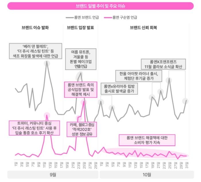 구순염의 원인으로 ‘적색 202호’라는 특정 색상이 지목되며 소비자 불안감이 커졌고, 9월 말에는 롬앤 측에서 공식 입장을 발표하고 환불 등 해결책을 제시하며 이슈 진화에 나섰다.