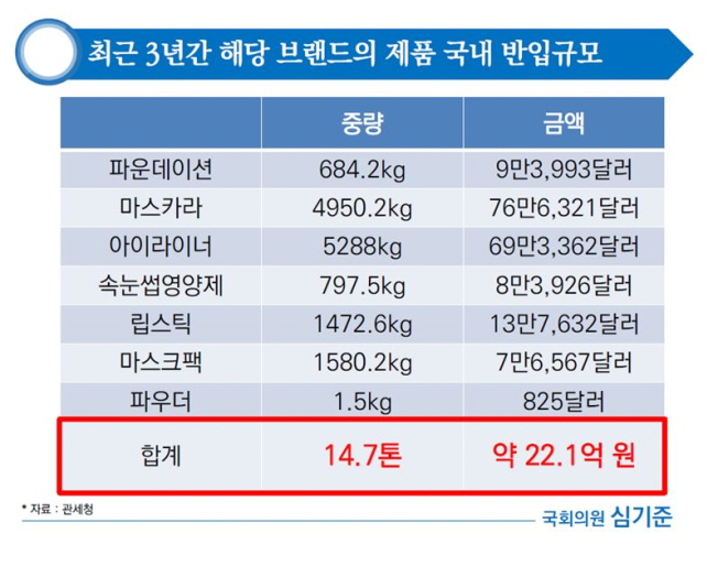 관세청에 따르면 마스카라 이외에도 파운데이션, 아이라이너, 속눈썹영양제, 립스틱, 마스크팩, 파우더 등 해당 브랜드(일본 업체)의 제품이 최근 3년간(해외직구 포함) 중량기준 14.7톤, 금액 기준 185만달러(한화 22.1억원) 규모로 국내에 유통된 것으로 나타났다.