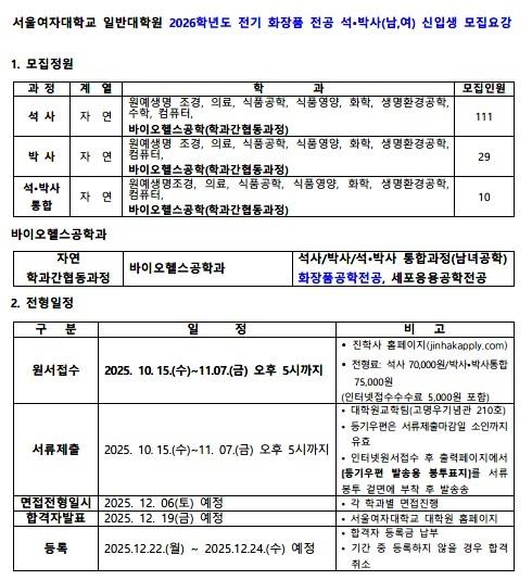 [CMN] 서울여자대학교 일반대학원은 2026학년도 전기 화장품 전공 석‧박사(남,녀) 신입생을 모집한다.