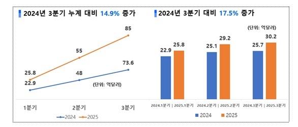 25년 3분기 수출액은 전년 동기보다 17.5% 증가한 30.2억 달러를 기록하며, 분기별 수출액도 최대치를 경신했다.