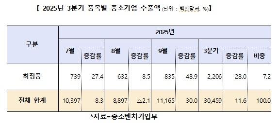 [CMN 심재영 기자] 중소벤처기업부(장관 한성숙)가 지난 27일 발표한 ‘2025년도 3분기 중소기업 수출 동향’에 따르면 25년 3분기 중소기업 수출액이 전년 동기 대비 11.6% 증가한 305억 달러를 기록, 역대 최고치를 기록했다. 25년 1~9월 누계 수출액도 전년 동기 대비 5.8% 증가한 871억 달러를 기록해 역대 최고치를 경신했다.