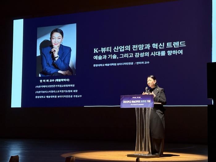 이번 행사는 지난 20일부터 22일까지 중앙대학교 아트센터에서 진행됐다. ‘예술과 기술의 융합, 미래를 그리다’를 주제로 각 전공별 대표 창작물과 학술 심포지엄, 공연 등이 어우러진 대규모 축제로, 안미려 한국메이크업전문가직업교류협회 회장은 협회 이사이자 중대 예술대학원 교수인 은광희 이사와 함께 참석해 자리를 빛냈다.