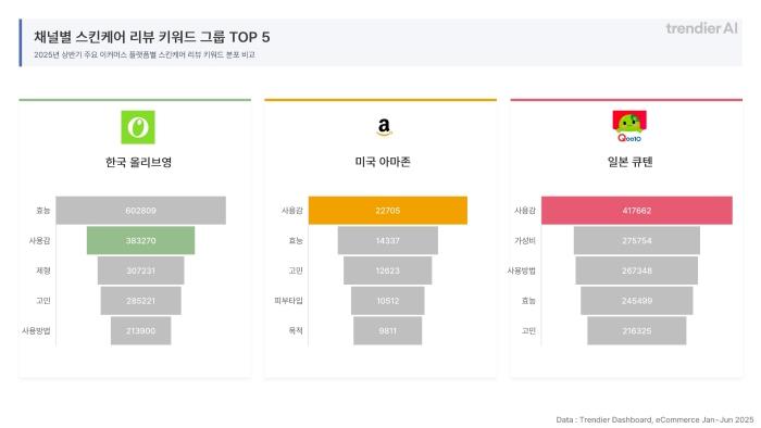 미국과 일본에서 ‘사용감’이 키워드 중 압도적 1위를 기록했고, 한국에서는 효능이 1위, 사용감과 제형이 바로 뒤를 잇고 있다.