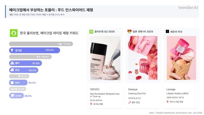 올리브영 2025년 상반기 데이터를 보면 생크림 텍스처 제품이 전년 대비 150% 급증했고, 무스 텍스처는 120%, 젤리 텍스처는 92.8%, 푸딩 텍스처는 80% 증가했다.