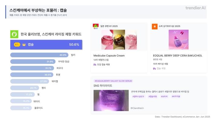 캡슐 포뮬레이션은 현재 K-뷰티에서 가장 빠르게 상승하는 포맷 중 하나다. 올리브영에 따르면 캡슐 제품 검색량과 판매량이 전년 대비 50% 이상 증가했다.