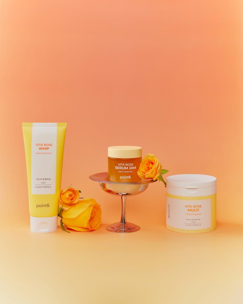 포인트앤 비타 로즈 라인은 세안 단계별로 선택해 사용할 수 있도록 △비타 로즈 멀티 클렌징 패드 △비타 로즈 세럼잼 팩 클렌저 △비타 로즈 휩 클렌징 폼 등 3종으로 구성됐다.