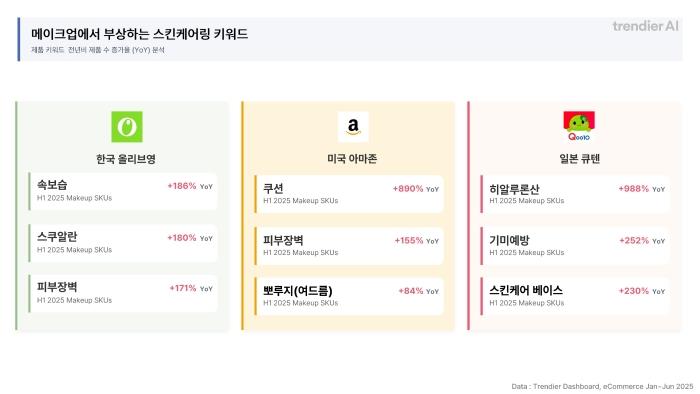 일본 큐텐(Qoo10)에서도 ‘히알루론산’이 988% 급증했고, ‘스킨케어 베이스’는 230% 증가했다. 일본 소비자들은 메이크업을 선택할 때 브라이트닝과 다크스팟 케어 기능을 적극적으로 찾는다.