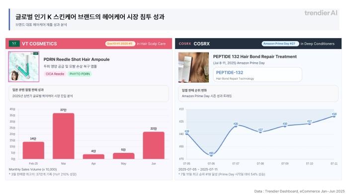 VT코스메틱은 ‘PDRN 리들샷 헤어 앰플’을 출시했고, 스킨케어의 피부 개선 콘셉트를 두피 건강으로 확장했다. 그 결과, 2025년 3월 일본 큐텐 헤어/두피케어 카테고리에서 월 판매량 37만 개를 기록하며 성공적으로 시장에 진입했다.