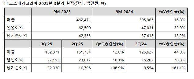 [CMN] 글로벌 화장품 OGM(글로벌 규격 생산) 전문 기업 코스메카코리아(대표이사 조임래·박은희)가 올 3분기 연결 기준 매출 1,824억 원, 영업이익 272억 원, 순이익 223억 원을 달성했다고 지난 6일 밝혔다.