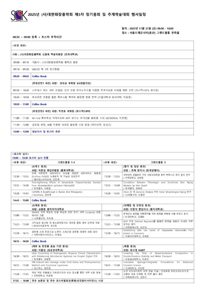 또한, 오전 초청강연은 코스맥스BTI 경서연 책임연구원, 서울대학교 이동훈 교수, IECKOREA 이은영 님, 데이터쿡 김성근 님 순으로 발표가 진행되고, 오후 세션은 소재, 제형, 평가 및 임상, 피부 & 천연물 효능 기전, 안전성, 대체법 등 분과 18편의 발표가 진행된다.