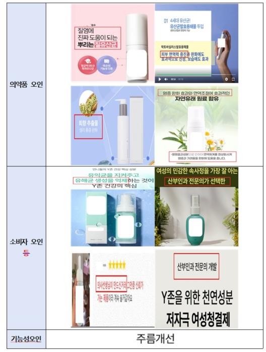 식약처 주요 적발 사례 [자료=식품의약품안전처][CMN 심재영 기자] 식품의약품안전처(처장 오유경)는 온라인에서 유통‧판매하고 있는 외음부 세정제, 미스트 화장품의 광고‧판매게시물을 점검한 결과, ‘화장품법’을 위반한 허위‧과대광고 75건을 적발해 방송통신심의위원회 등에 접속 차단을 요청했다고 지난 24일 밝혔다.