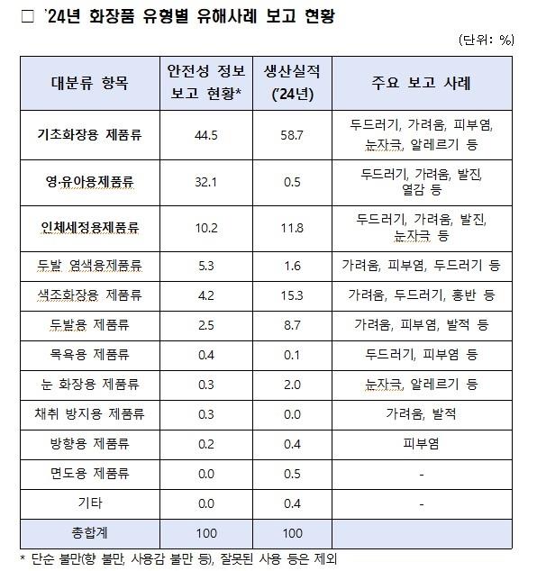2024년 보고된 유해사례 중 향, 사용감 등 불만족과 같은 단순 불만 628건을 제외한 1,298건을 분석한 결과, 기초화장품 제품류(577건, 44.5%), 영‧유아용 제품류(417건, 32.1%), 인체 세정용 제품류(133건, 10.2%) 순으로 확인됐다.